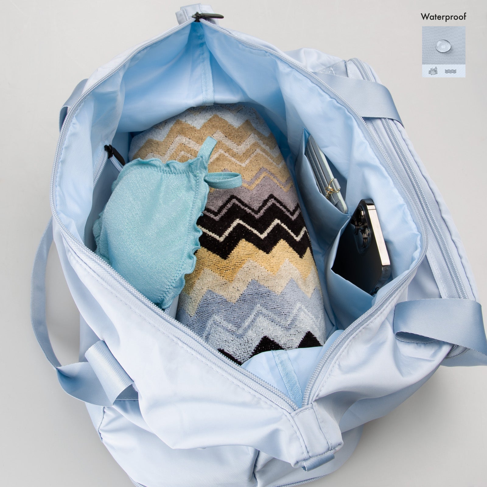 All’interno della borsa è presente una tasca waterproof con zip che consente di riporre il costume o la biancheria bagnata: riuscirai, così, a separarli da indumenti asciutti o da altri oggetti.