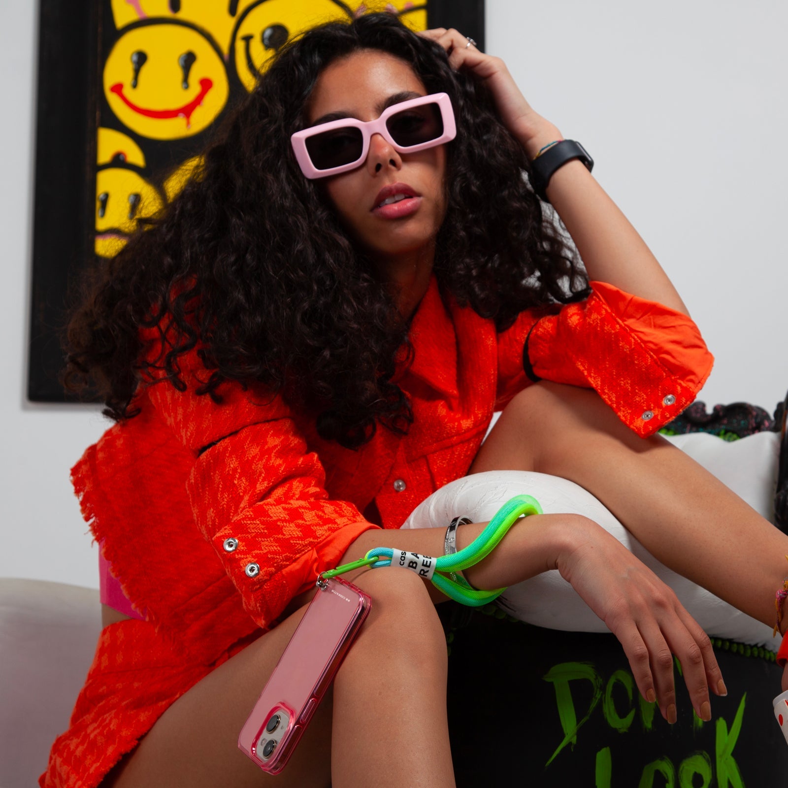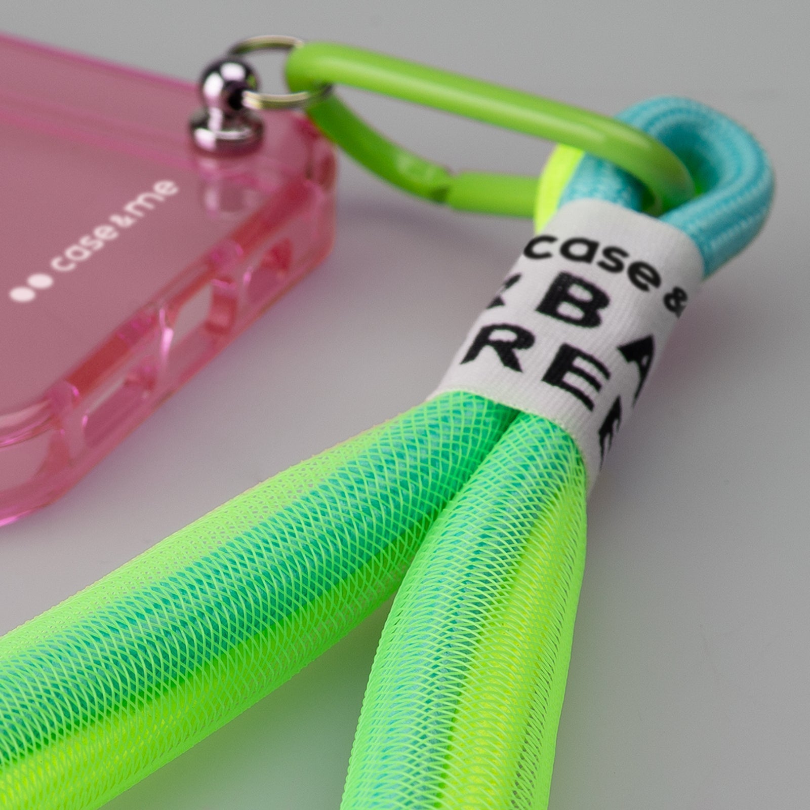 Sulla parte inferiore della cover è presente un soffice laccetto contraddistinto da colori fluo. Grazie al pratico gancio a forma di moschettone potrai attaccarlo e staccarlo ogni volta che vuoi, utilizzandolo in diversi modi: per tenere il cellulare al polso, per personalizzare uno zainetto oppure per tenere le chiavi di casa.